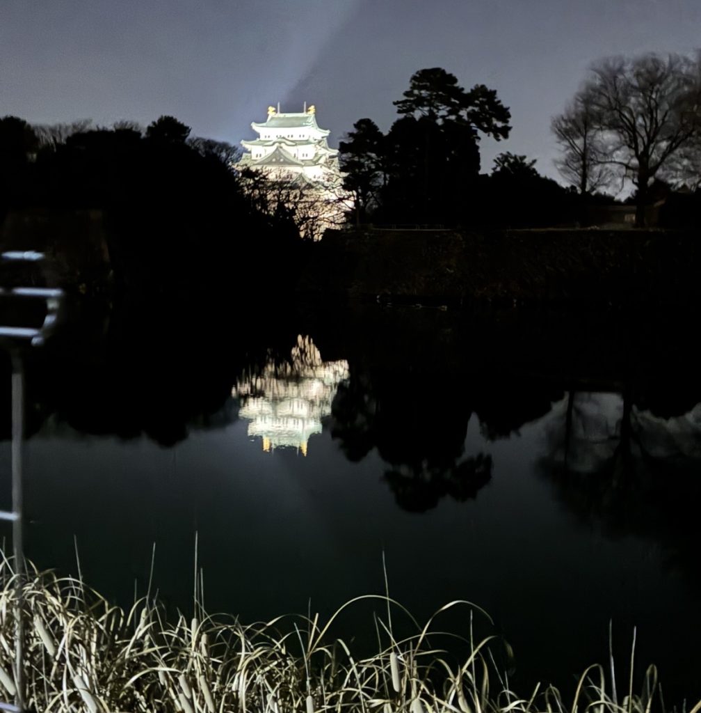 知らない町の道すがら、辿り着くまでの心細さや、23時のライトアップまでに着きたい焦り。やっと着いた視線の遠く向こうに、思ったより、だいぶちっちゃいシャチホコ。